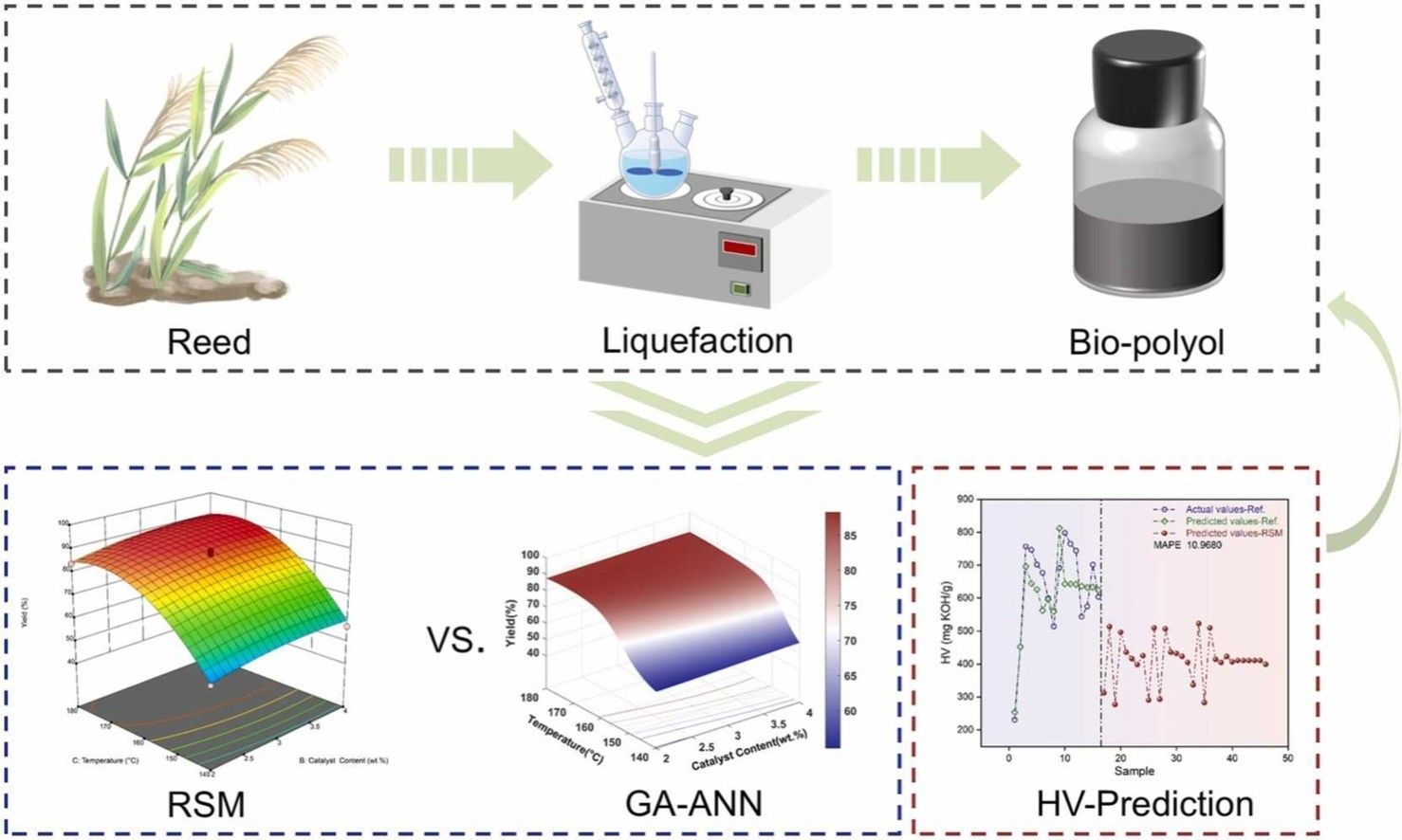 本研究采用RSM和GA-ANN模型对芦苇液化过程进行建模和优化,并比较了这两种模型在预测芦苇基多元醇得率方面的适用性。此外,本研究还应用了之前研究所开发的木质纤维素生物质酸催化液化过程的预测模型,对芦苇的液化产物羟值进行了预测,旨在降低生物质化学品开发阶段的成本。本研究有助于深入理解芦苇的液化过程,为芦苇资源的高值化利用和生物基高分子材料产业的低成本、可持续发展提供了重要的参考依据。