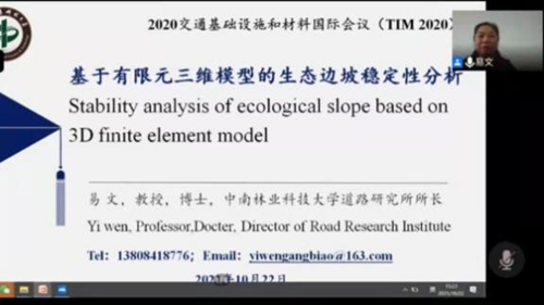 2021年10月21-22日由长沙理工大学主办、我院协办,我院段绍伟院长作为组织委员会成员,易文教授作为技术委员会成员的第五届交通基础设施和材料国际会议顺利召开,来自世界各地的道路、桥梁、岩土、材料的专家和学者参加了此次盛会。来自美国麻省理工等13所知名高校、香港理工大学、国内清华大学等40所大学和研究院共73位特邀专家在大会上做了特邀报告,我院易文教授主持了“韧性和耐久性”分会场,并作为特邀专家做了题为“基于有限元模型的生态边坡稳定性分析”的报告,介绍了通过构建试验段生态边坡三维模型,分析南方多雨地区草灌植物根系对边坡稳定性的影响,研究了根土体复合体的应力应变特性,分析了不同降雨量条件下植物防护前后边坡稳定性的变化规律。研究成果为分析植物根系的固土护坡效应,提供了可靠的理论依据,也为生态护坡技术的推广和运用奠定了技术基础。