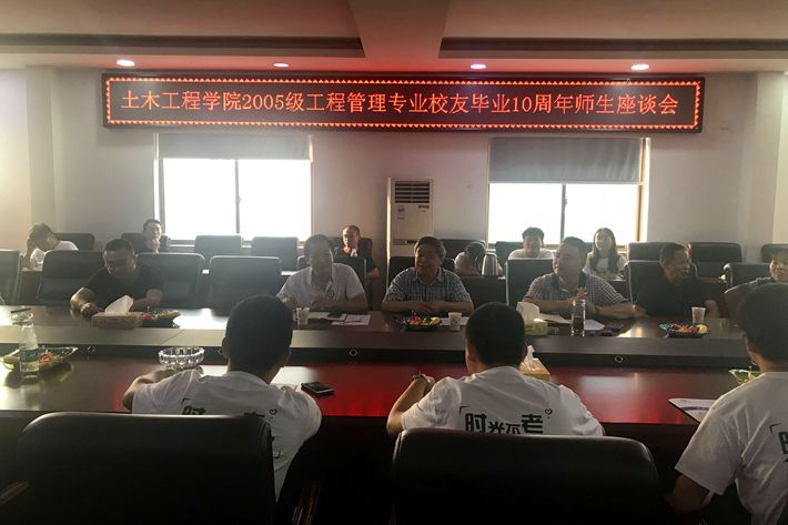10月4日下午,2005级工程管理专业校友毕业十周年师生座谈会在土木楼603室进行。学校校友办主任张仕吉、土木工程学院党委书记易锦、唐小弟教授、陈顺良教授、汤燕群副教授、何惊宇老师、蒋龙老师和30余名返校校友参加了座谈会。会上,与会人员重温了学校形象宣传片——《逐梦绿水青山》;易锦简要介绍了学院近年来建设和发展概况;与会的各位校友讲述了自身10年来的工作经历和发展状况;各位当年任课教师畅谈了当年教学中的点点滴滴;张仕吉对座谈会进行了总结,并对校友们提出了工作和生活的建议,同时诚挚邀请校友们常回家看看。