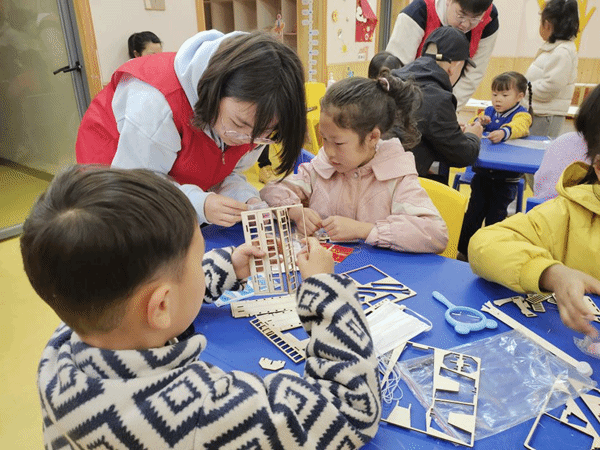 课堂上,“公益老师”们通过精美视频展示和模型实物讲解的方式,引导孩子们理解建筑工程原理和内在美学。在指导制作升旗台和斜拉桥模型的实践过程中,让小朋友在玩乐中提升创造力和想象力,培养实践能力和团队合作意识。“老师,看我的作品!未来我也要当工程师。”一位小朋友兴奋地举起自己拼接制作的模型,赢得满堂喝彩。