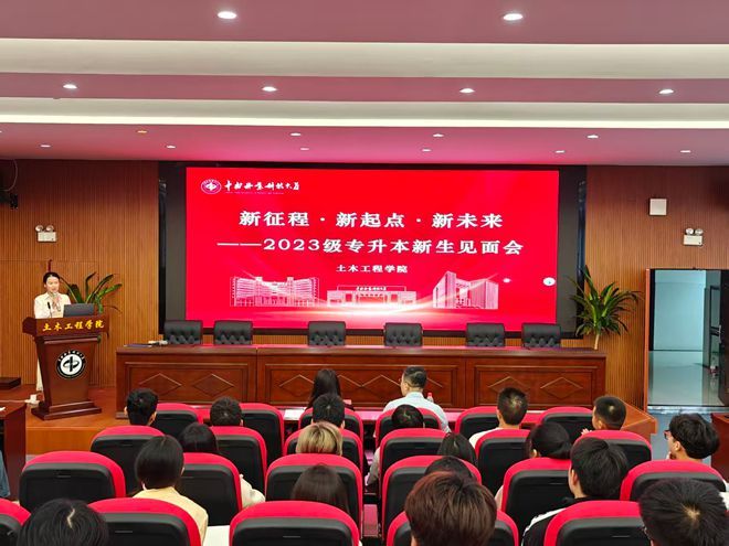 9月19日中午12:00,土木工程楼501报告厅召开土木工程学院2023级专升本新生见面会。大会由土木工程学院2023级辅导员义子楚主持,党委副书记汪灵丹、教学副院长孙广臣、班主任刘剑出席见面会,全体2023级专升本新生共同参会。